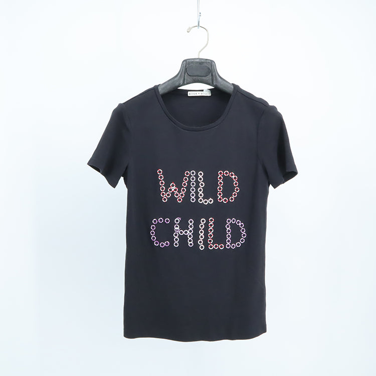カラフルな色合いでデザインされた「WILD CHILD」の文字が特徴的なTシャツ。背面は無地でシンプルかつ遊び心のあるカジュアルトップスです。